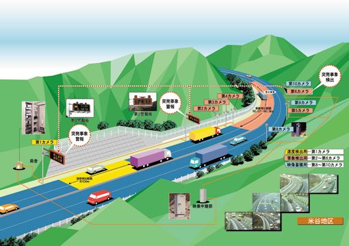 車両に警告を行うとともに、事故発生時には道路状況監視カメラが自動検出し後続車両に警告します。検出情報は事務所にも伝送され迅速な対応が図られます。