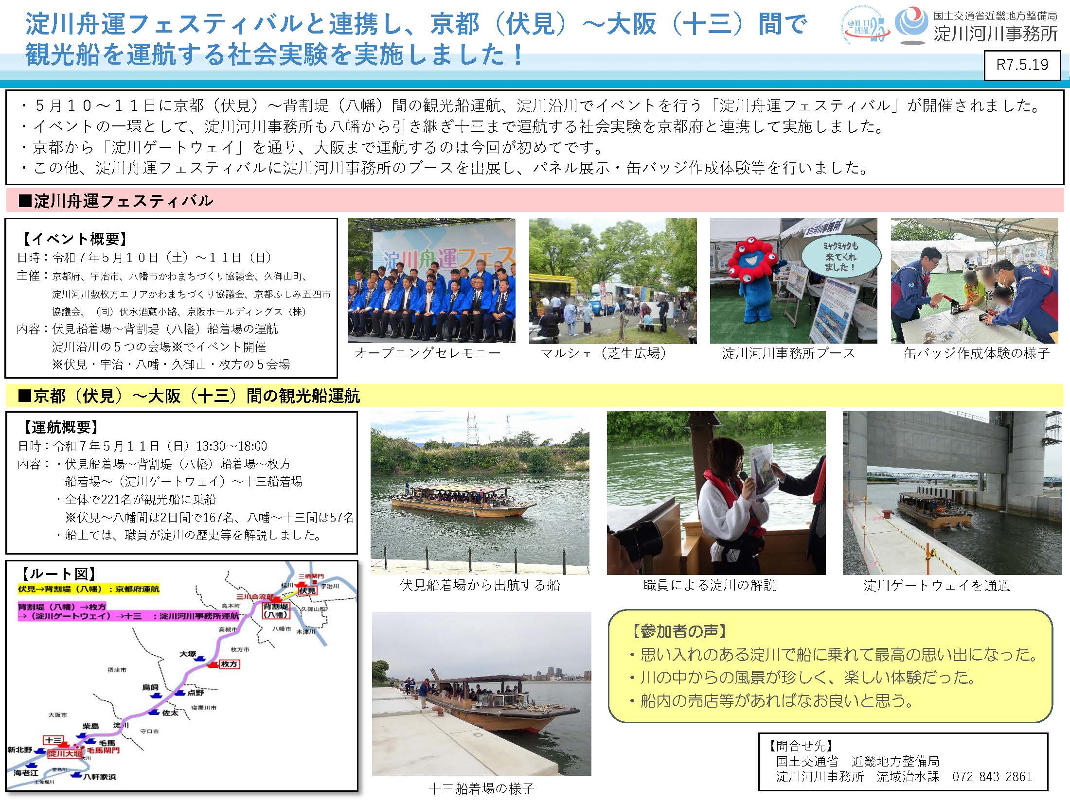 【淀川河川事務所】淀川舟運フェスティバルと連携し、京都(伏見)~大阪(十三)間で観光船を運航する社会実験を実施しました!