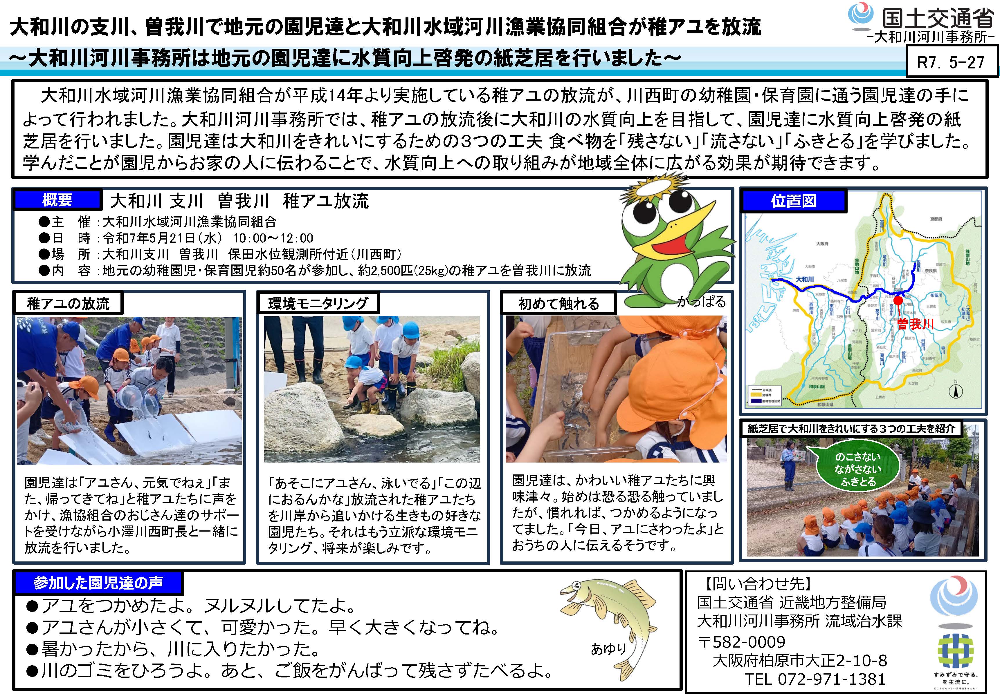【大和川河川事務所】大和川の支川、曽我川で地元の園児達と大和川水域河川漁業協同組合が稚アユを放流