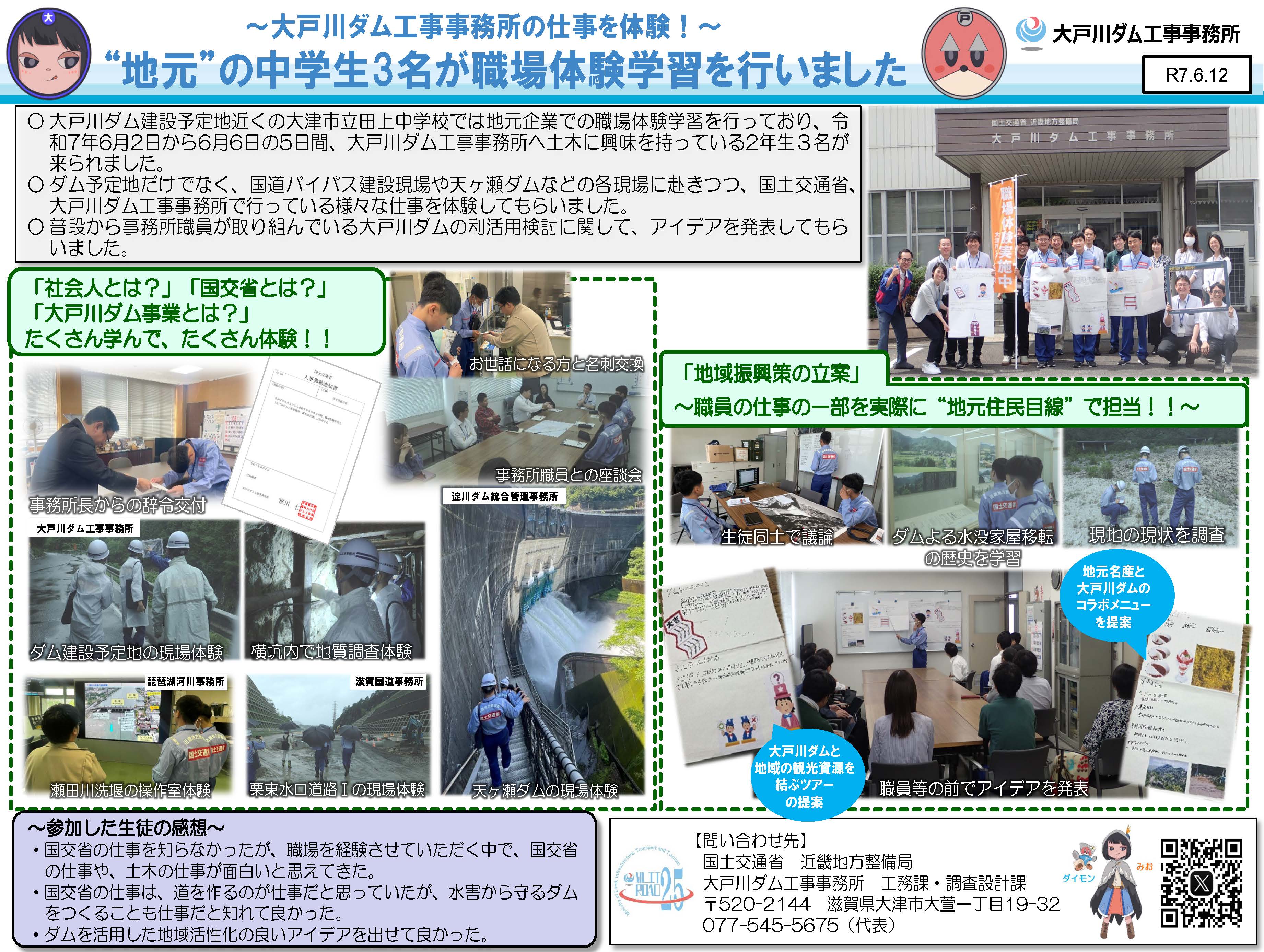 【大戸川ダム工事事務所】“地元”の中学生3名が職場体験学習を行いました