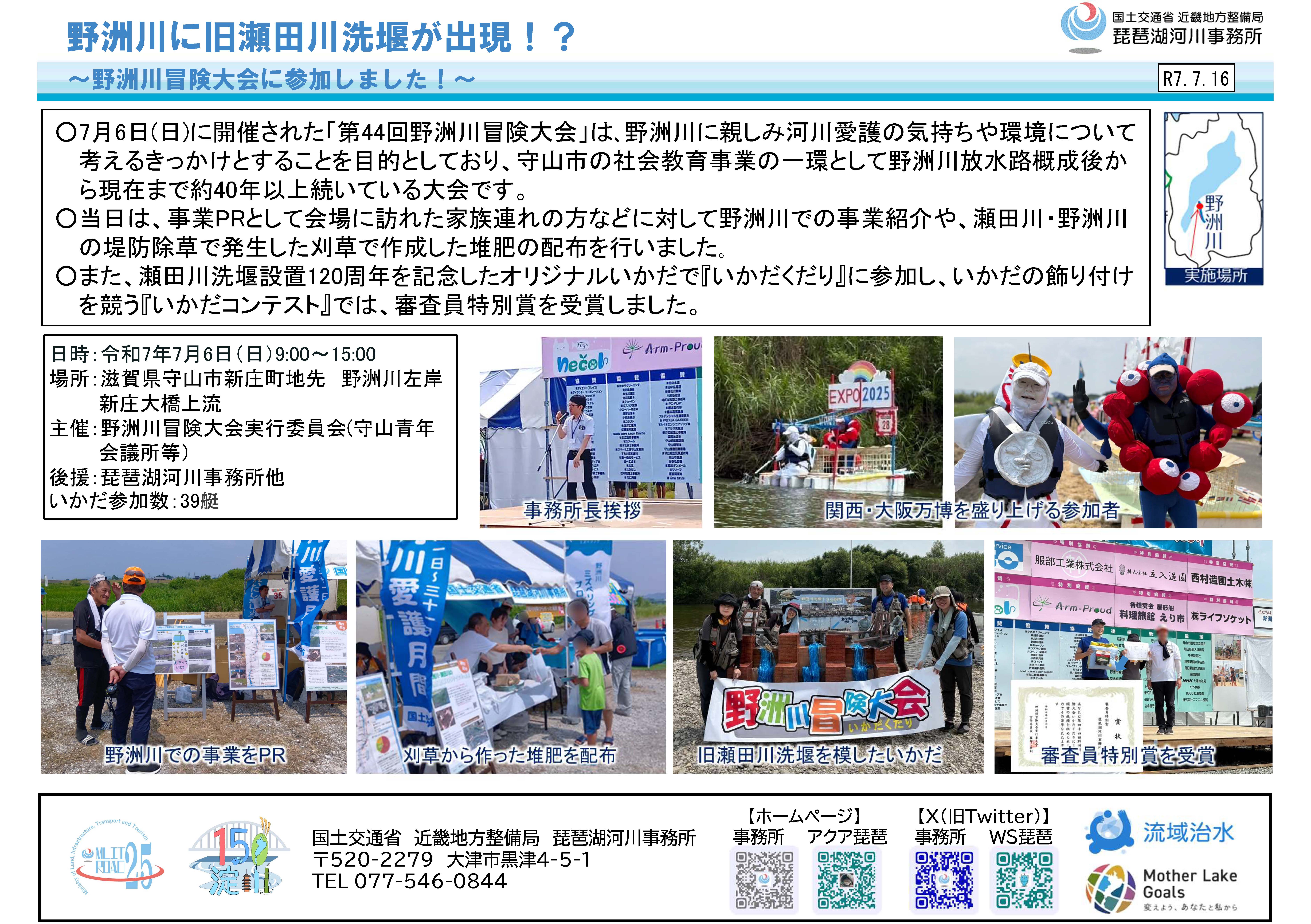 【琵琶湖河川事務所】 野洲川に旧瀬田川洗堰が出現!?~野洲川冒険大会に参加しました!~
