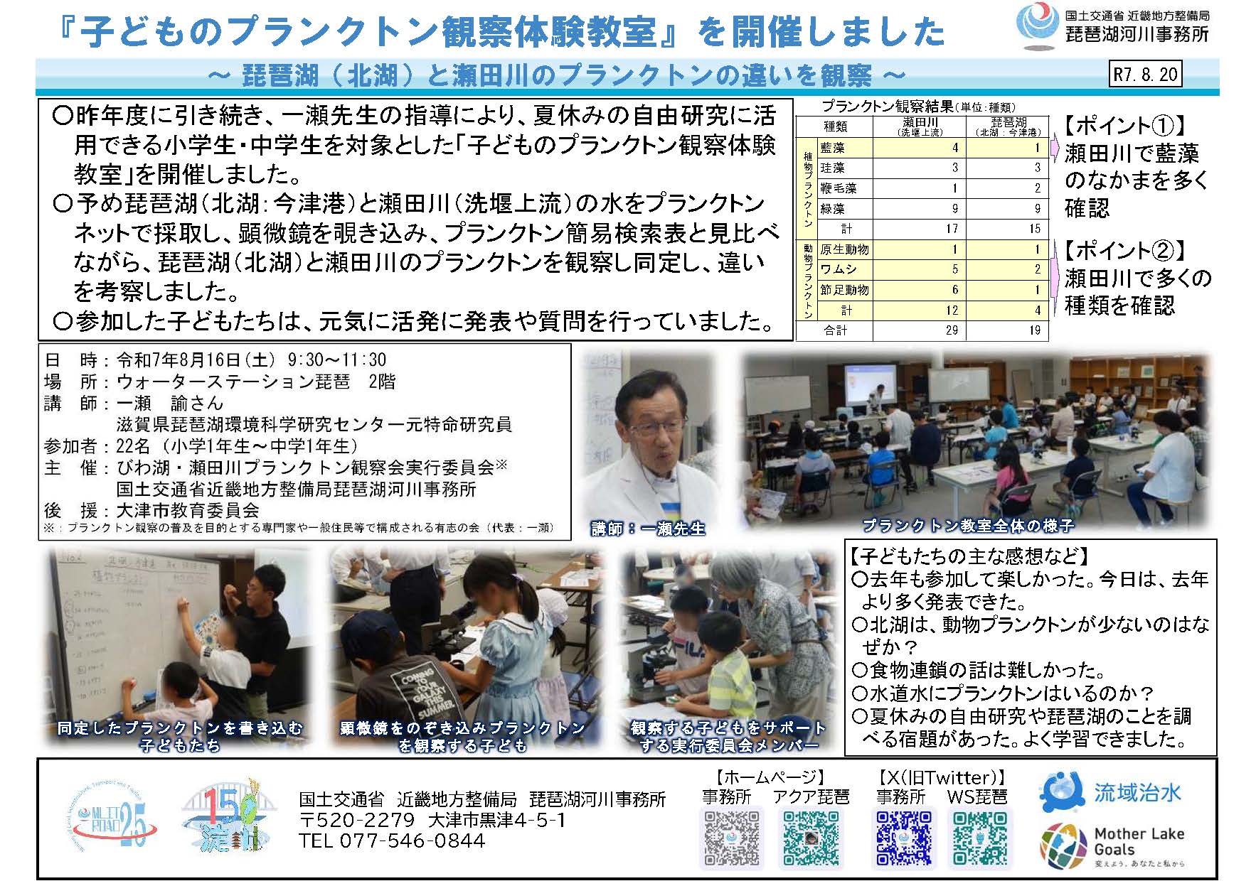 【琵琶湖河川事務所】『子どものプランクトン観察体験教室』を開催しました~琵琶湖(北湖)と瀬田川のプランクトンの違いを観察~