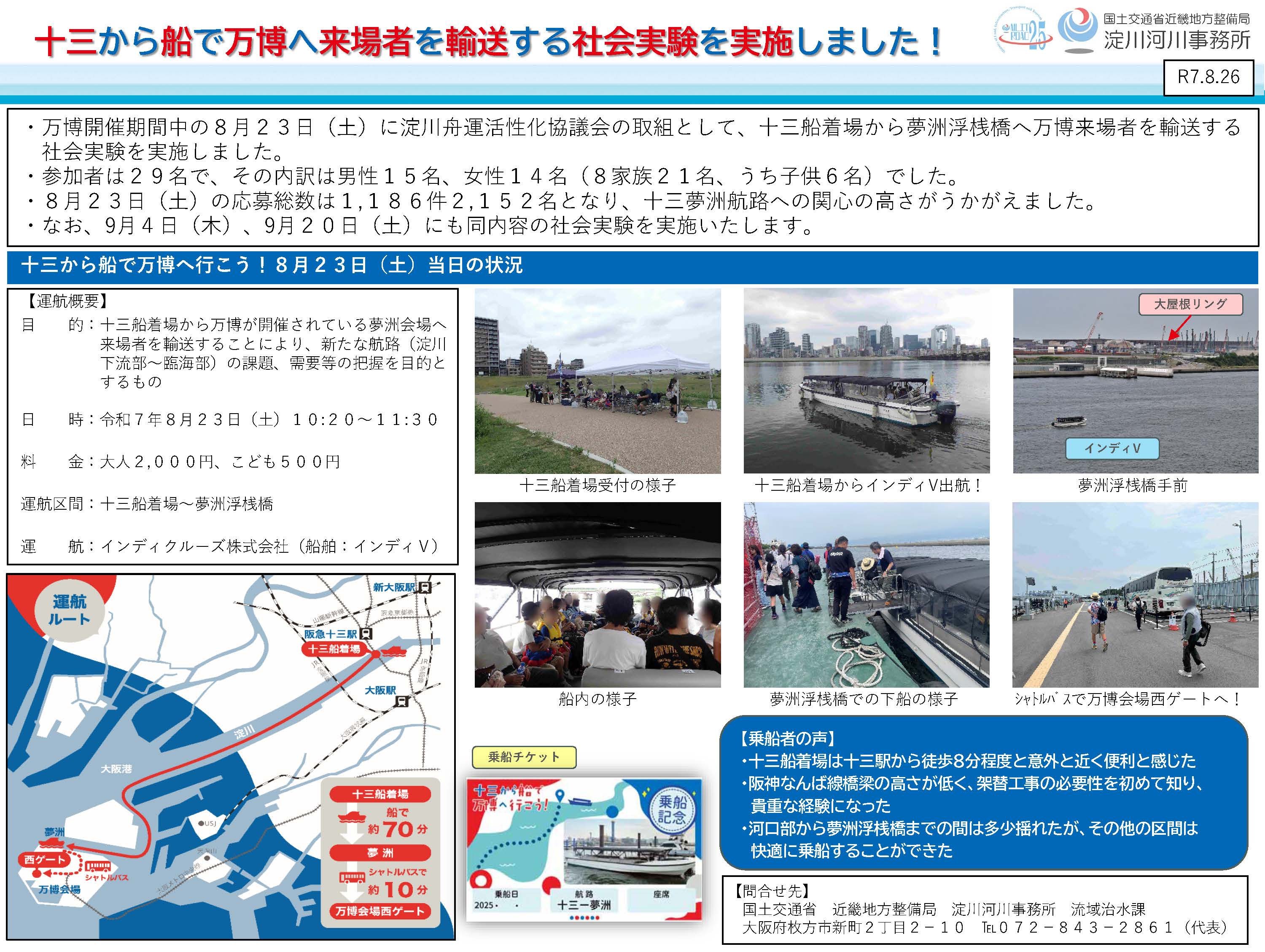 【淀川河川事務所】十三から船で万博へ来場者を輸送する社会実験を実施しました!