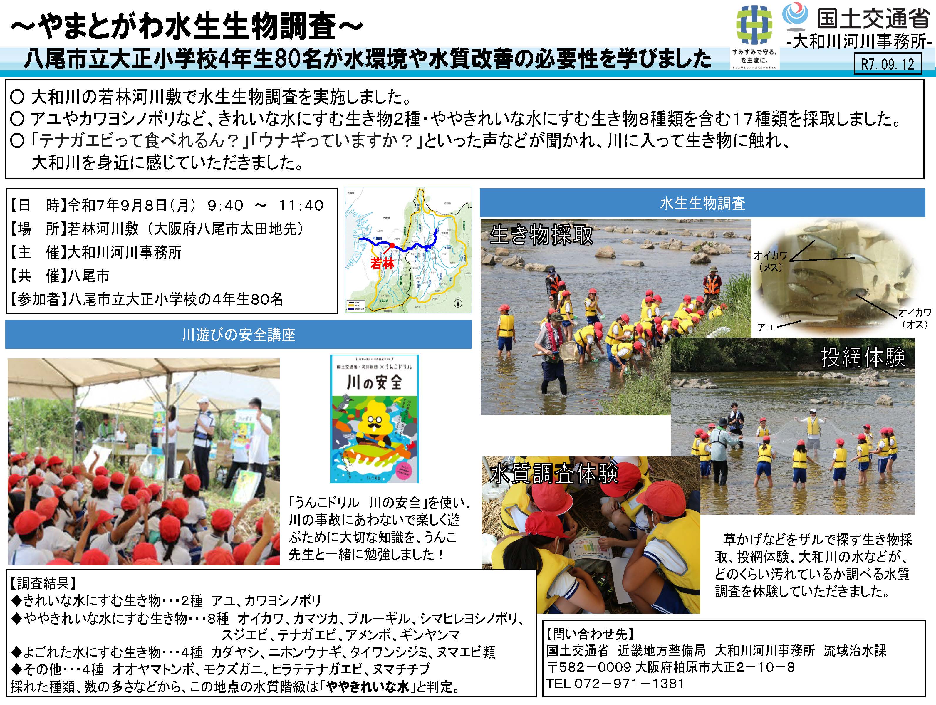 【大和川河川事務所】~やまとがわ水生生物調査~八尾市立大正小学校4年生80名が水環境や水質改善の必要性を学びました