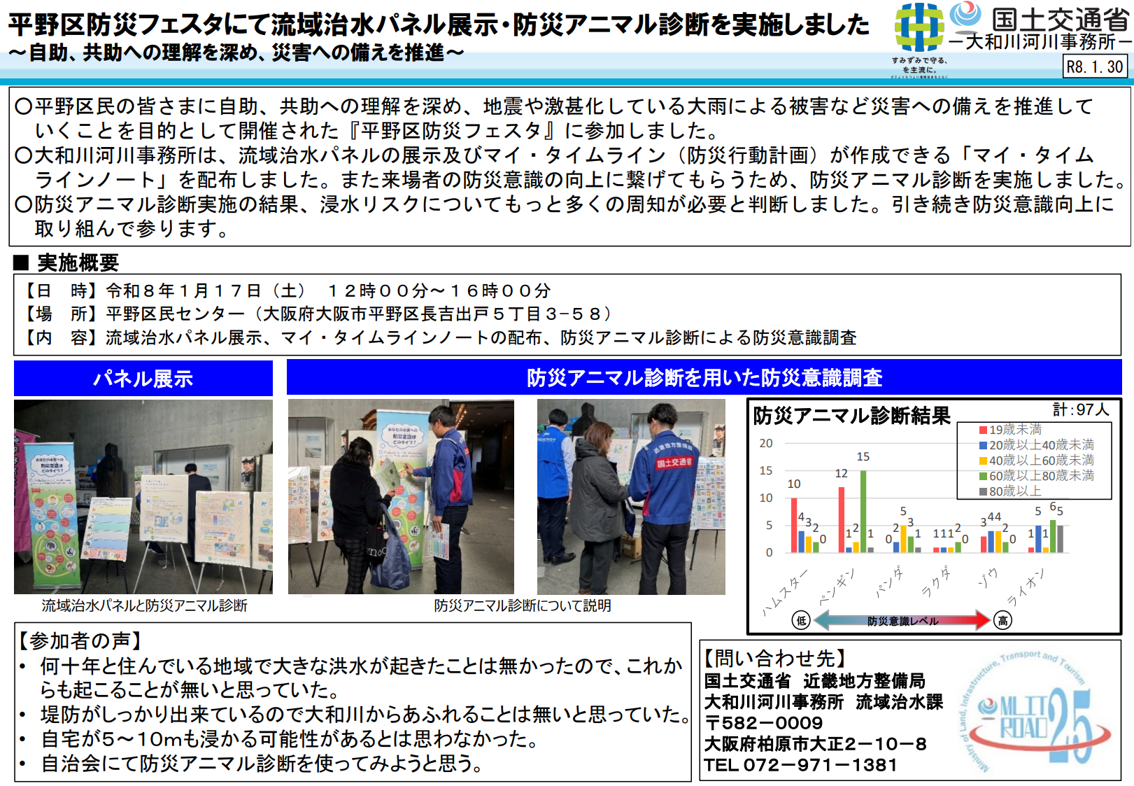 【大和川河川事務所】平野区防災フェスタにて流域治水パネル展示・防災アニマル診断を実施しました
