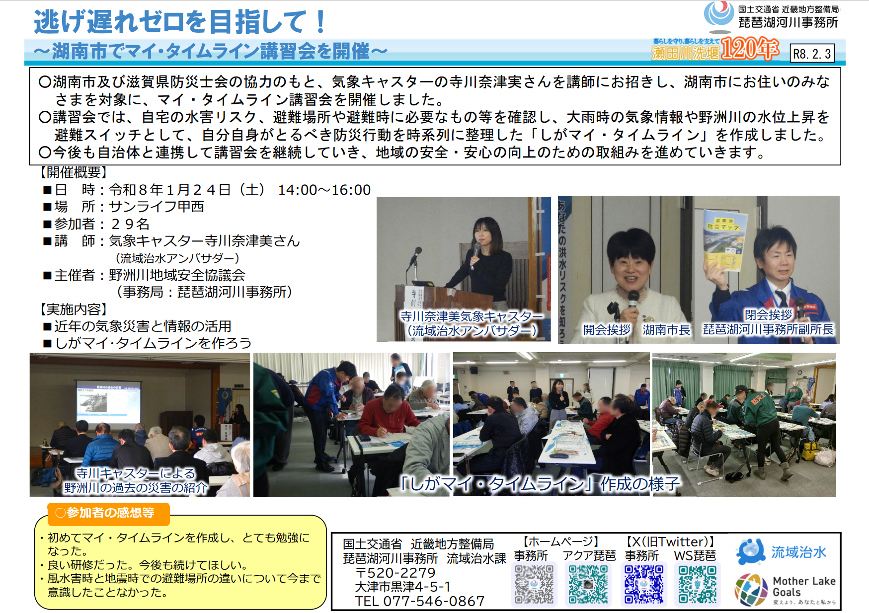 【琵琶湖河川事務所】逃げ遅れゼロを目指して!~湖南市でマイ・タイムライン講習会を開催~