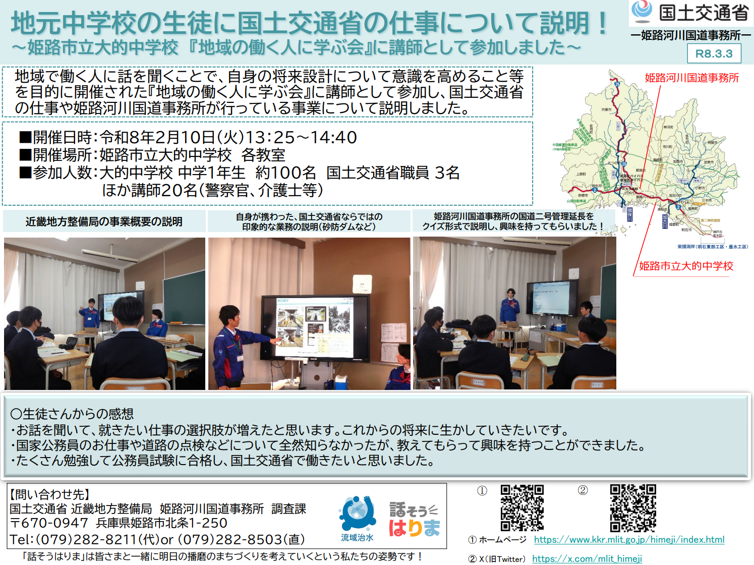 【姫路河川国道事務所】地元中学校の生徒に国土交通省の仕事について説明!~姫路市立大的中学校「地域の働く人に学ぶ会」に講師として参加しました~