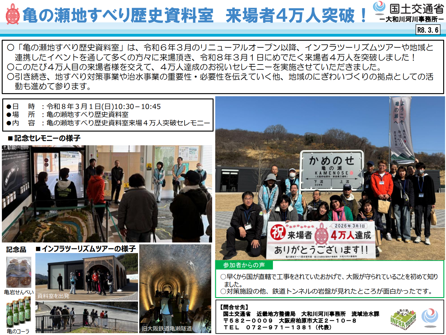 【大和川河川事務所】亀の瀬地すべり歴史資料室 来場者4万人突破!