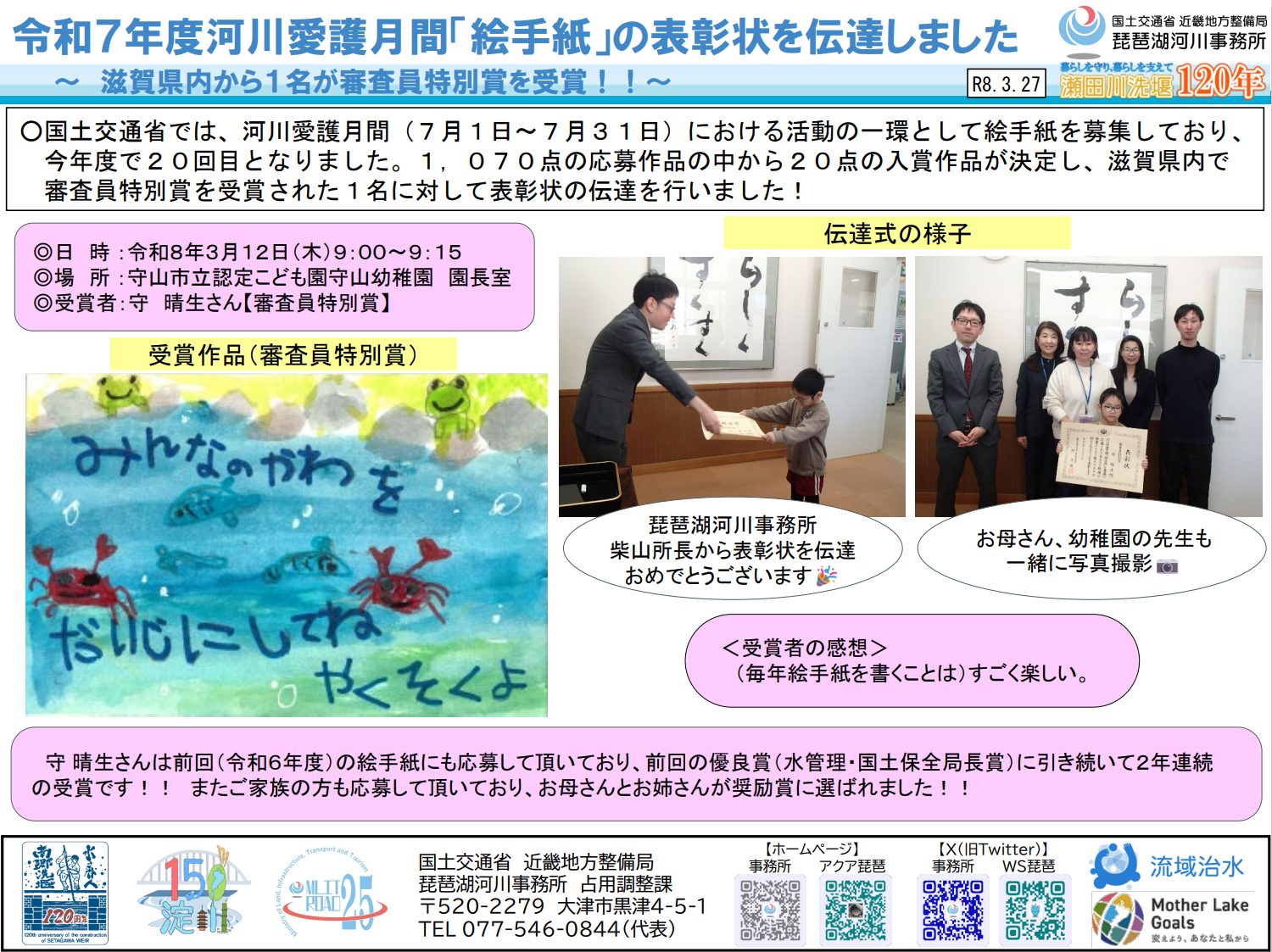 【琵琶湖河川事務所】令和7年度河川愛護月間「絵手紙」の表彰状を伝達しました