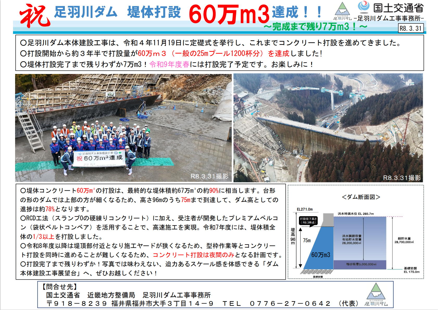 【足羽川ダム工事事務所】祝 足羽川ダム 堤体打設 60万m3達成!!