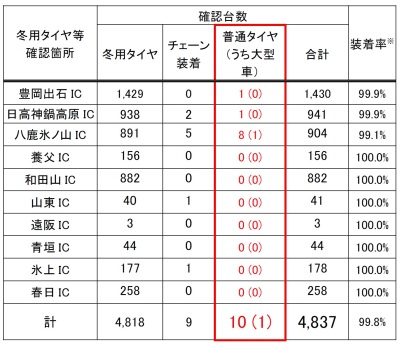 1 台〕確認されました。普通タイヤの車両は一般道に引き返していただきました。