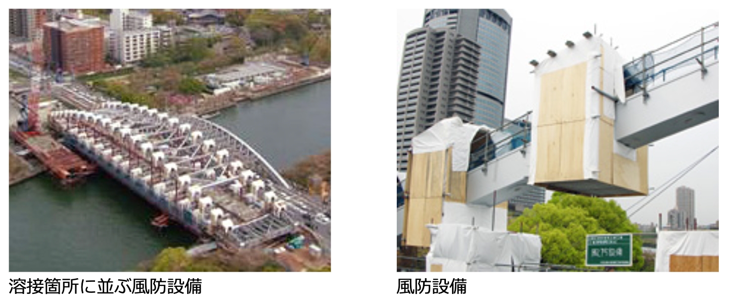 溶接作業は、風による作業への影響・欠陥の発生を防ぐため、作業箇所に風防設備を設けて行われました。