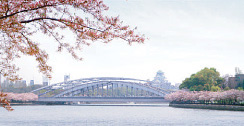 昭和5年に架け渡されて以来、大阪のシンボルとして、人々に親しまれてきた桜宮橋(通称 銀橋)。四季を通じて大阪の風景に彩りを与えてきた。夏には、大阪天満宮の天神祭の船渡卸と花火で、春は、造幣局の通り抜けで、遠来の人々にも広く親しまれている。