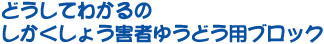 ブロック・タイルはゆかに使う、ブツブツのつきでたものです。ブツブツが点になっているものはあぶないことやあぶない場所を知らせています。ブツブツが線になっているものは、進む方向をしめしています。 ゆうどう用ブロックは、しかくしょう害者を守るたいせつなものです。ブロックの上に物をおいたり、自転車をとめないようにしましょう。