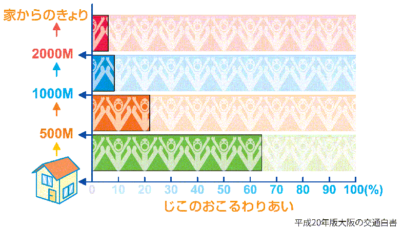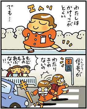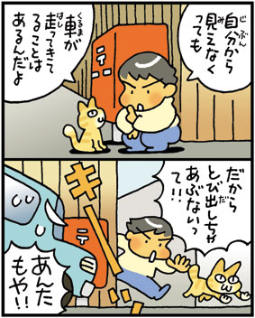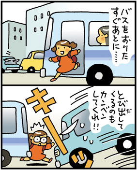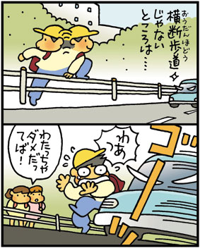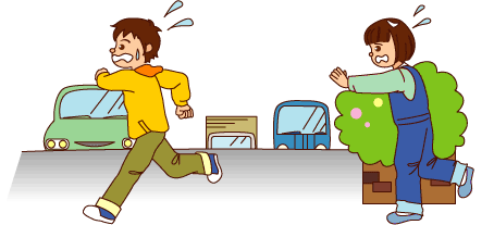 ![]() 大きな道をかってにおうだんすると、道をわたるのに時間がかかるうえ、車は思ったより早く近づいてきます。 |