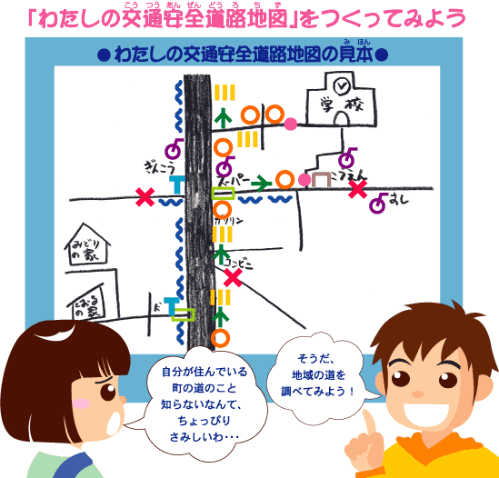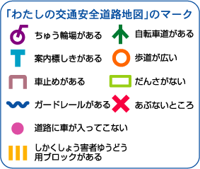 家から学校までの地図をかいて、安全をたしかめる道路地図をつくってみましょう。 ここで学んだ交通安全のための道路のくふうを地図に書き、通学(つうがく)やおつかいに行くときの安全な道路をたしかめましょう。 マークの見本をお手本に、自分の地図にマークを書きこみましょう。
