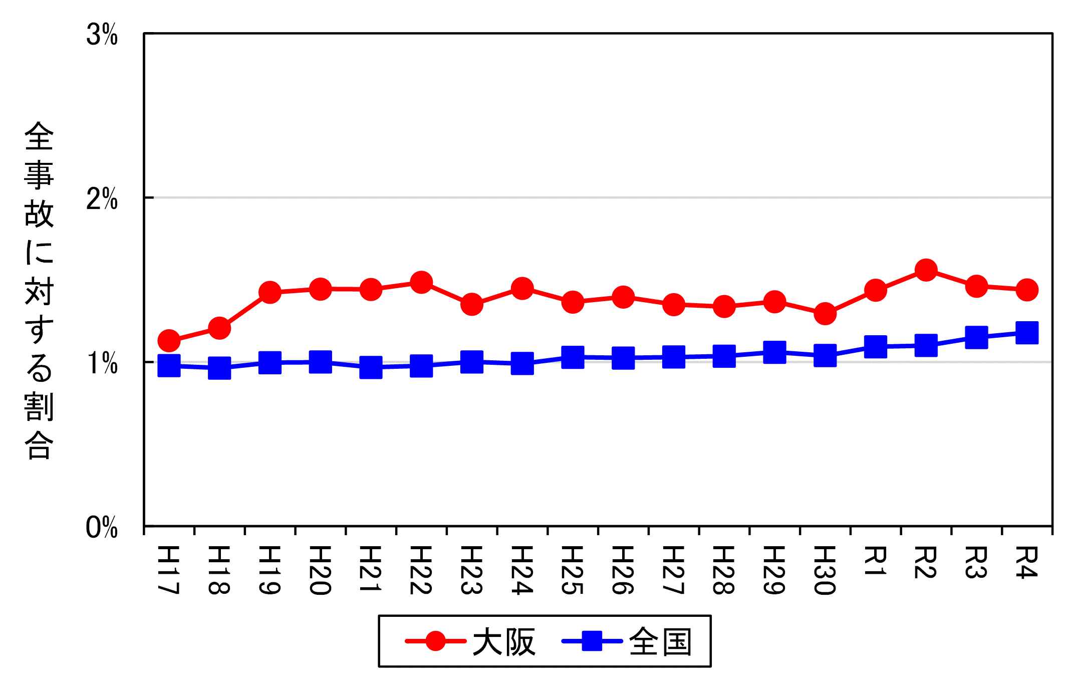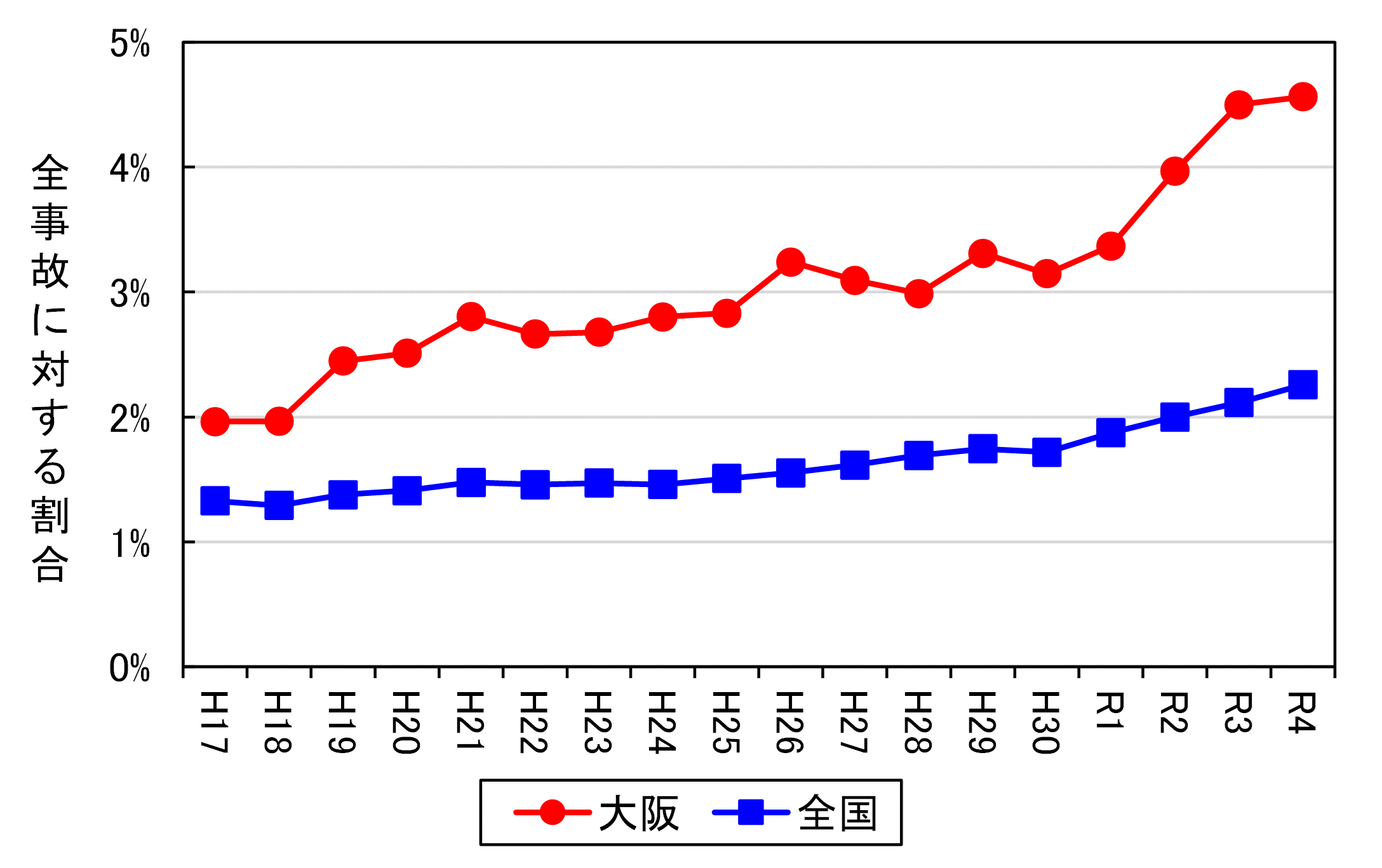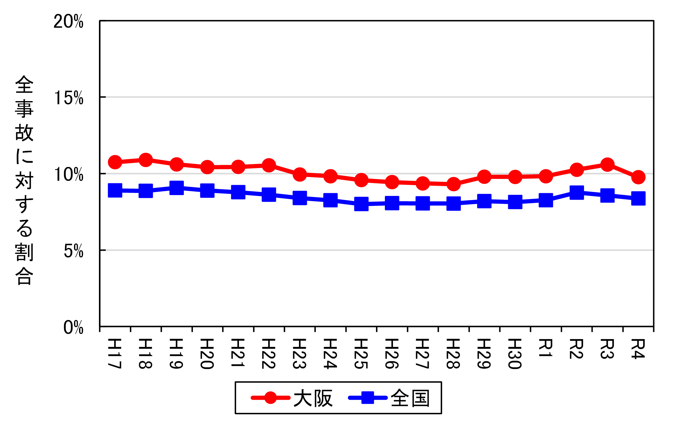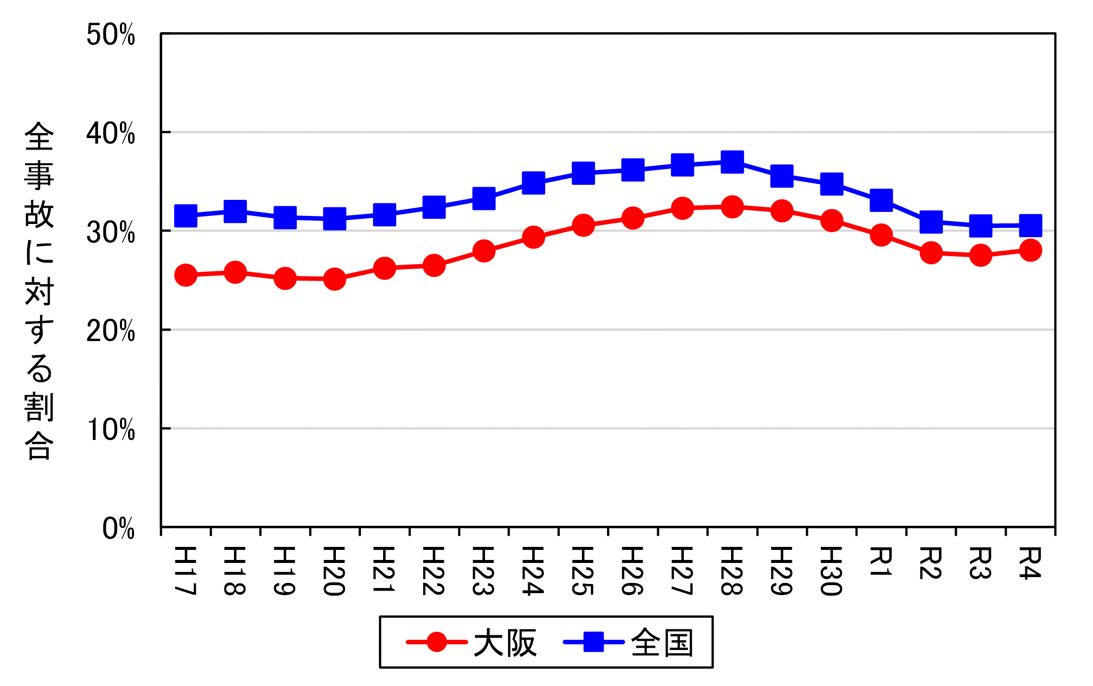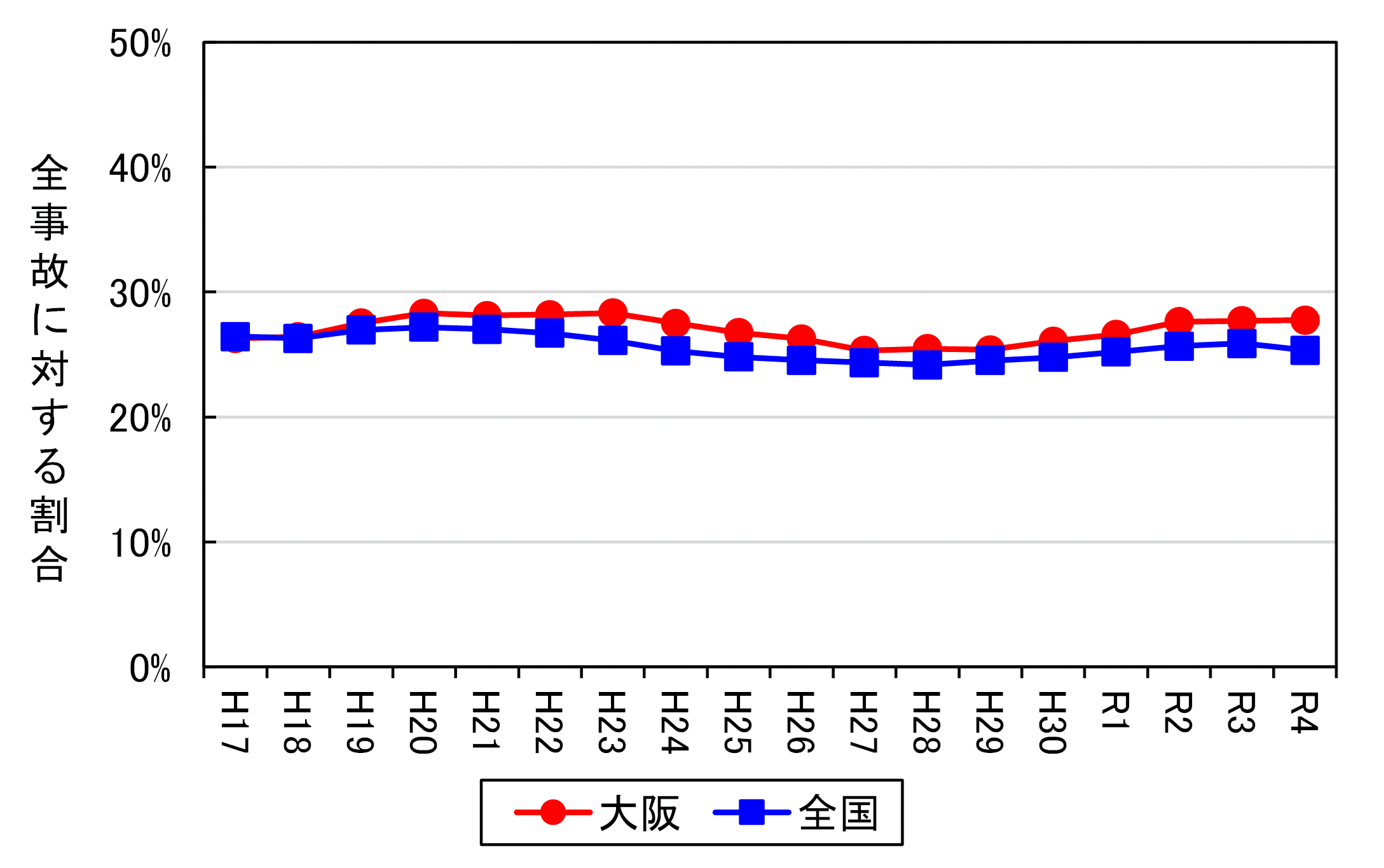 ・出合頭事故は、大阪・全国とも同等の発生割合です。