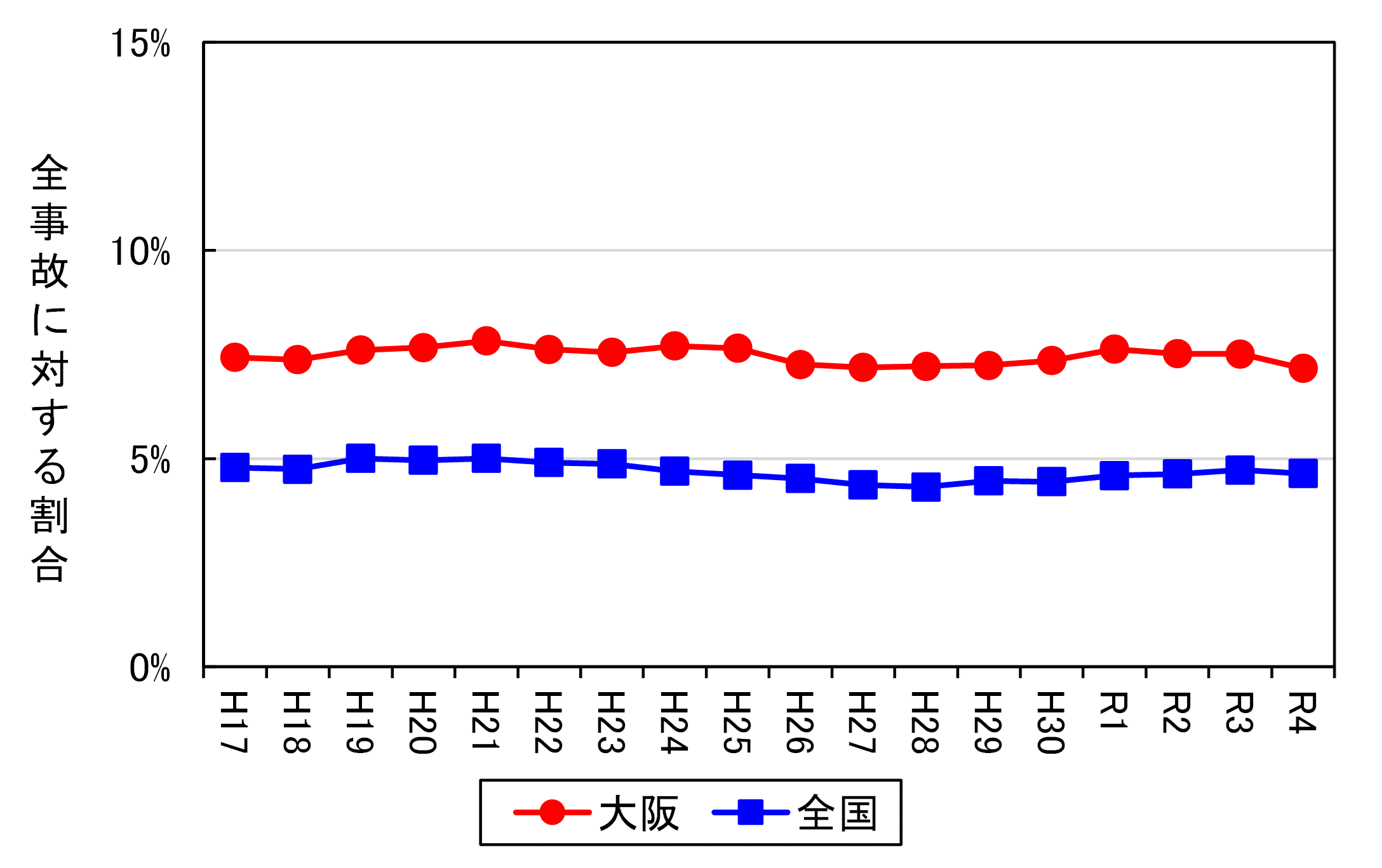 (財)交通事故総合分析センター令和5年8月発行「交通事故統計年報(令和4年版)」 (財)大阪府交通安全協会令和5年4月発行「大阪の交通白書(令和4年版)」 |