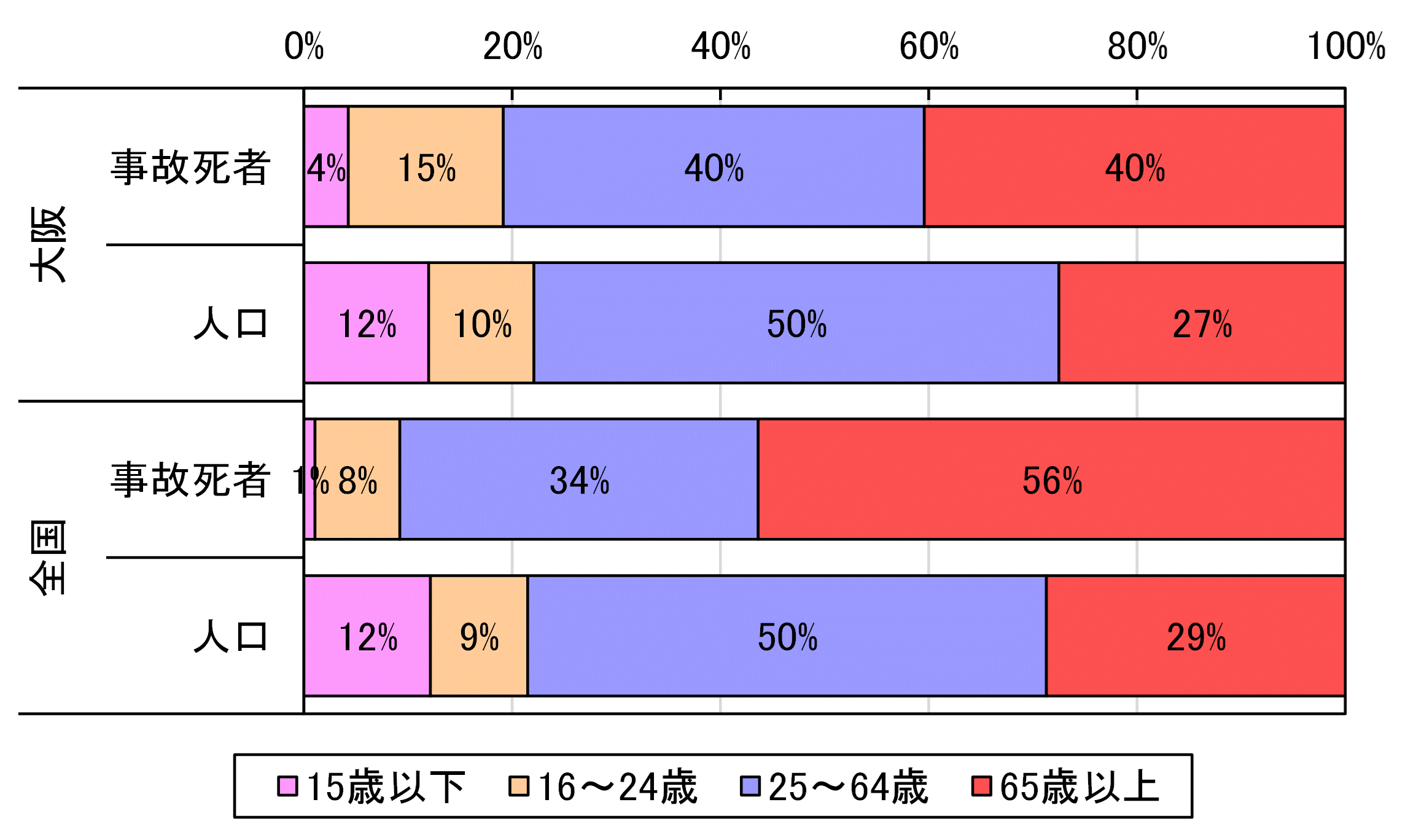 ▲図 大阪および全国の事故死者・人口の年齢割合