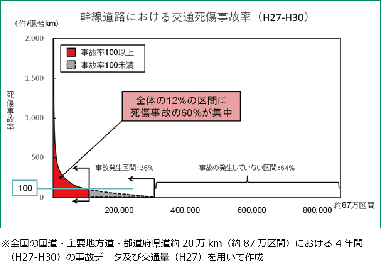 これらを分析すると、幹線道路で発生した死傷事故の約60%が全体の約12%の区間に集中していることがわかります。
