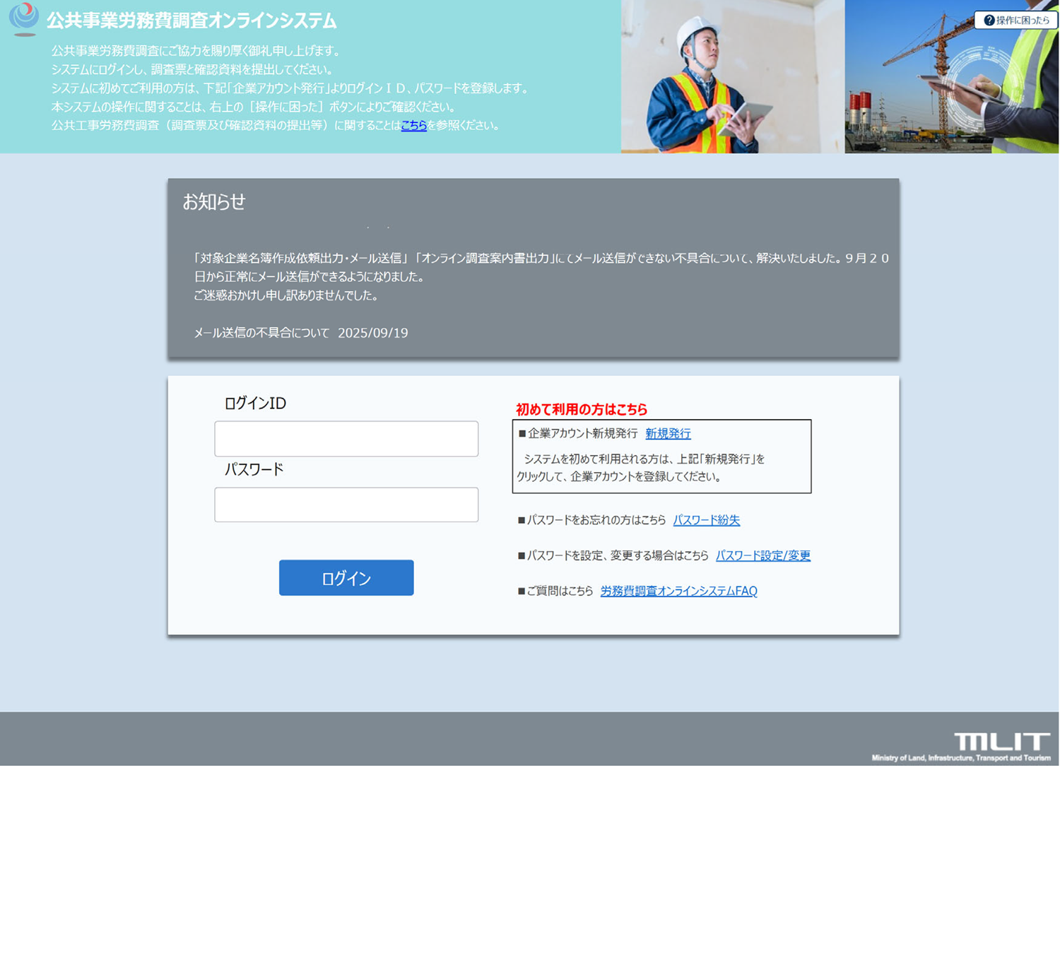 「トップメニュー」→「労務費調査」の「調査書類提出」をクリックする。
