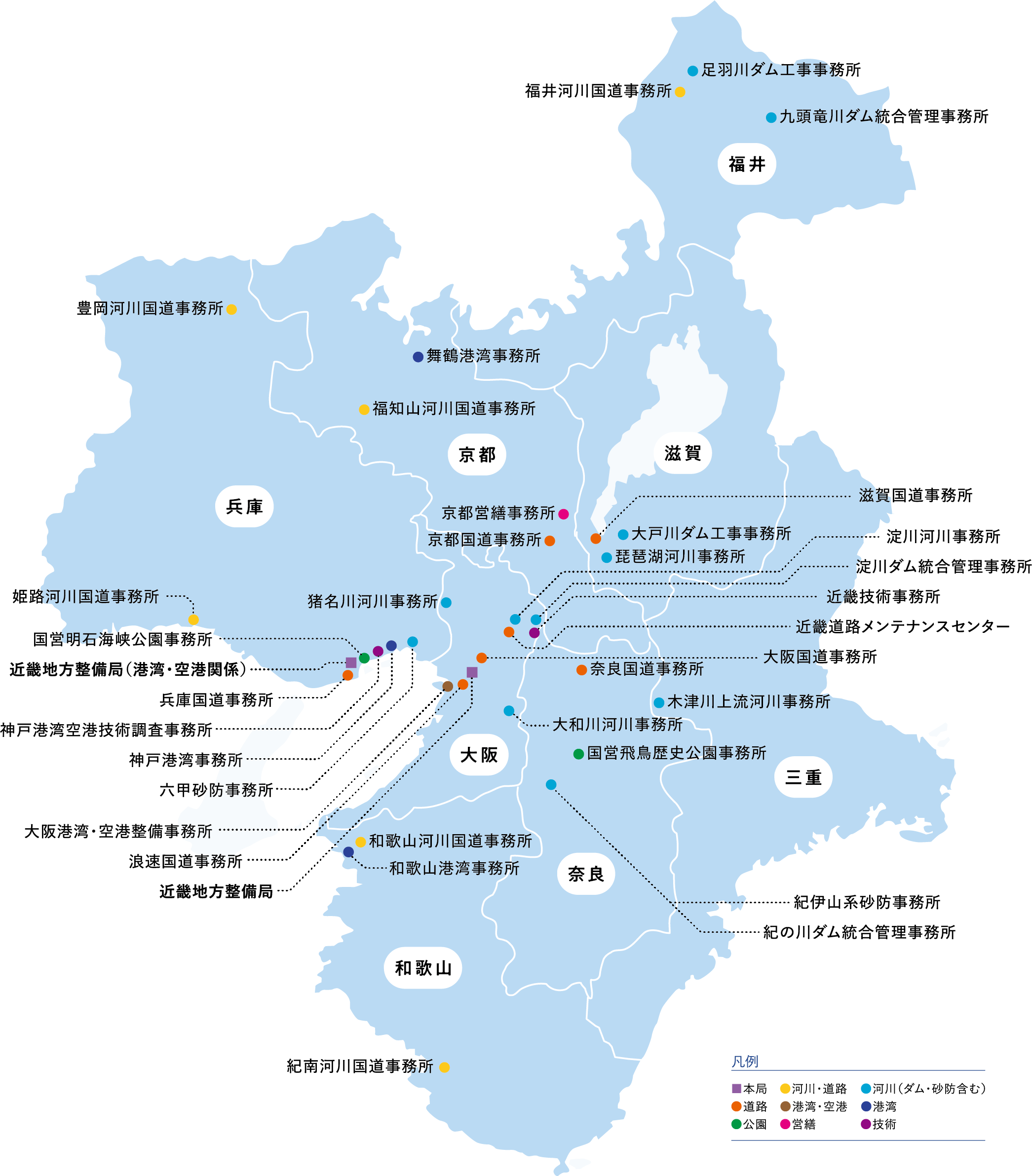 - ●近畿地方整備局は、大阪府・兵庫県・京都府・奈良県・滋賀県・和歌山県・福井県の全域と三重県の一部地域を管轄しています。