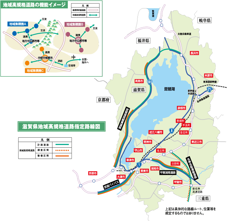 地域の発展を促進するためには、核となる都市を中心とした地域集積圏の形成が必要となります。そのため、地域高規格道路は、名神高速道路や北陸自動車道等と一体となって幹線道路ネットワークを形成。地域の振興及び活性化に貢献します。