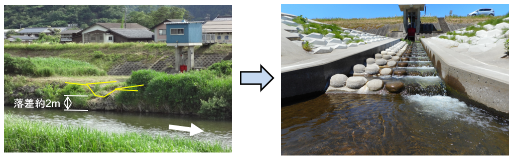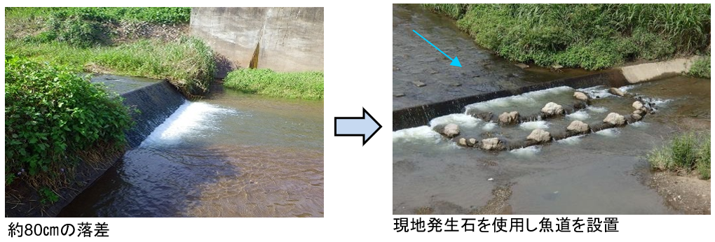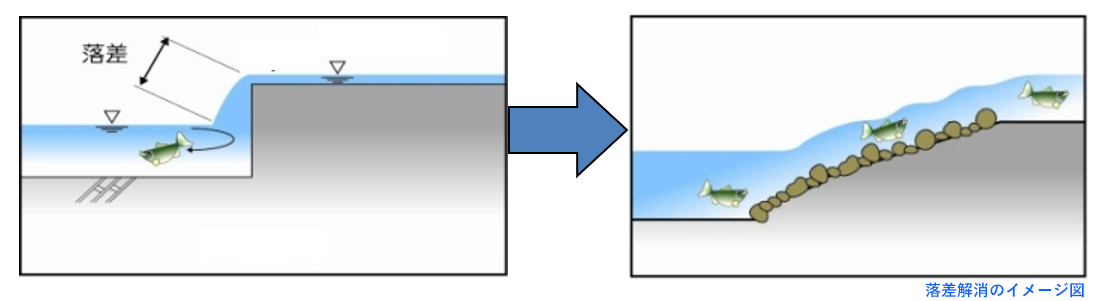河川と水路の連続性の確保 円山川と流入する支川、樋門・樋管の接続部には落差が形成されているものが多く、魚類等の生物の移動障害となっています。 魚道等を設置し落差を解消することにより円山川本川及び支線における縦断方向の連続性が確保されます。 樋門の段差解消 八代水門の落差改善 寺内第一樋門の落差改善