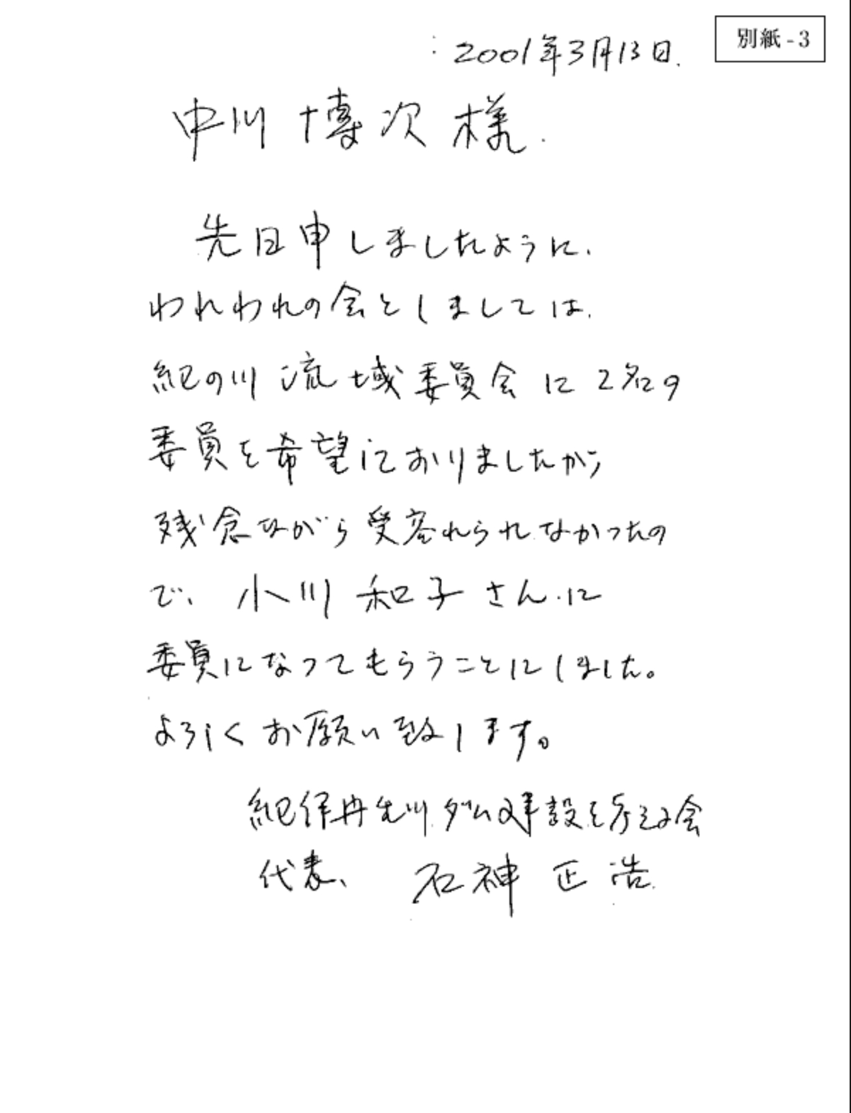 - 別紙-1 紀の川流域委員会準備会儀委員の皆様への要望書 紀伊丹生川ダム建設を考える会