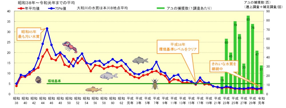 平成20年からは環境基準レベルをクリアしていますが、一級河川の中では、大和川の水質はまだ最低水準にあります。