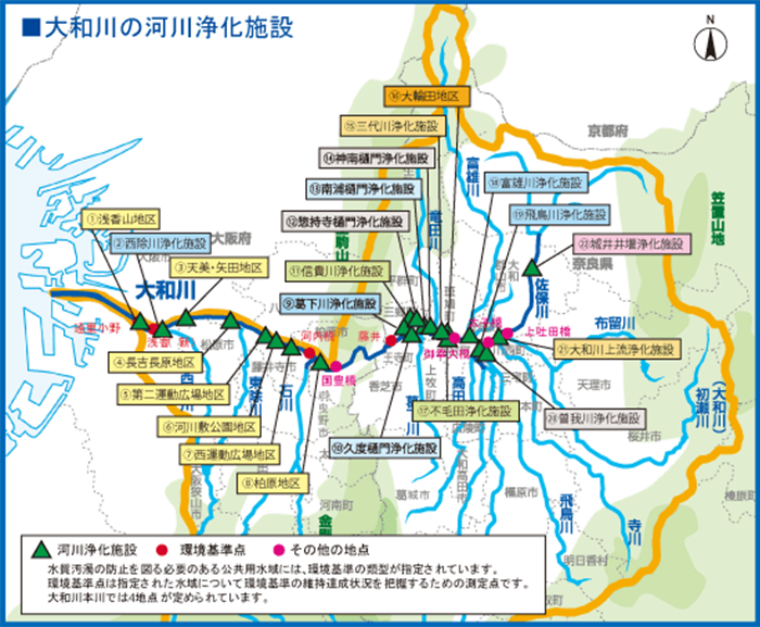 さまざまな河川浄化施設の整備 大和川の河川浄化施設 大和川流域では、河川浄化施設の整備を実施しており、平成19年度末で19箇所が完成しました。整備は川が本来持っている「自浄作用」を活用したものなど、様々な浄化方法を組み合わせて効率的な水質改善に努めています。 大和川で活躍している浄化施設 「瀬と淵方式」 大和川下流浄化施設 (1)浅香山地区(3)天美・矢田地区 (4)長吉長原地区 (5)第二運動広場地区 (6)河川敷公園地区 (7)西運動広場地区 (8)柏原地区 「礫間接触酸化方式」 (9)葛下川浄化施設 (18)富雄川浄化施設 (19)飛鳥川浄化施設 「薄層流浄化方式」 (2)西除川浄化施設 (15)三代川浄化施設 (21)大和川上流浄化施設 「直接接触酸化方式」 (22)城井井堰浄化施設 「植生浄化方式」 (11)信貴川浄化施設(17)不毛田浄化施設 「上向流接触酸化方式」 (12)惣持寺樋門浄化施設(14)神南樋門浄化施設(20)曽我川浄化施設 「接触酸化方式」 (10)久度樋門浄化施設(13)南浦樋門浄化施設 「砂ろ過+流離方式」 (16)大輪田地区浄化施設