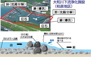 川が本来もっている「自浄作用」が多く発揮できる「瀬」と「淵」を再現した浄化方法。川の流れがゆっくりとした「淵」では汚濁物質を沈殿・接触分解する場を持たせ、また水の流れが速い「瀬」では、接触酸化に必要な酸素供給や砂礫間を通る際のろ過機能を持たせています。