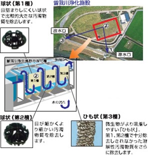 (月)汚れた河川水を接触材の間に通し、汚濁物質の沈殿吸着・生物分解などを行います。