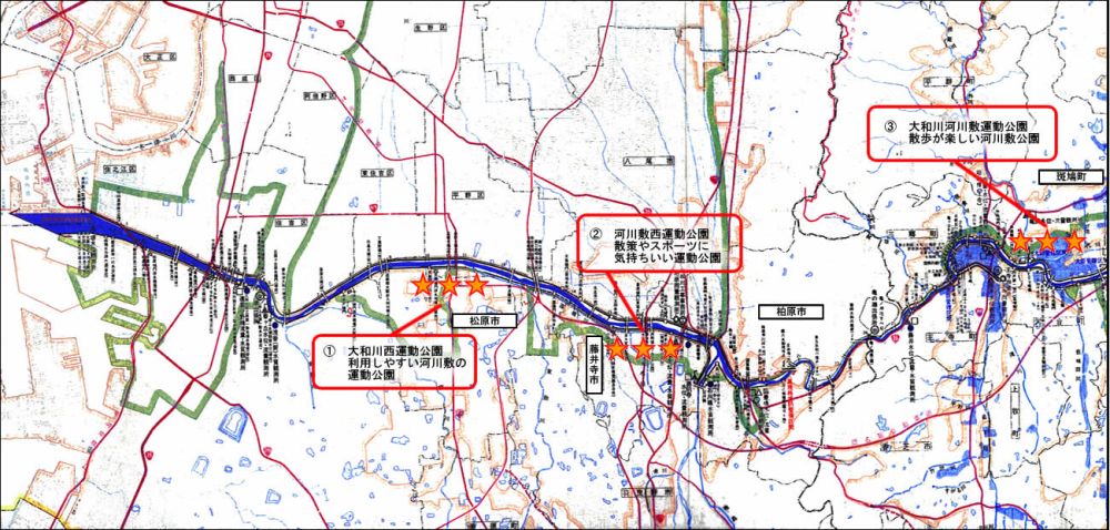 普通 | (1)大和川西運動公園 (2)河川敷西運動公園 (3)大和川河川敷運動公園 |
