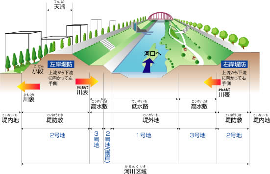 一般に堤防の川裏の法尻から、対岸の堤防の川裏の法尻までの間の、河川としての役割を持つ土地を河川区域と呼びます。河川区域は洪水などの災害を防止するために必要な区域であり、河川法が適用される区域です。河川区域には河川法で定める区域があり、それぞれ1号地、2号地、3号地と呼ばれています。