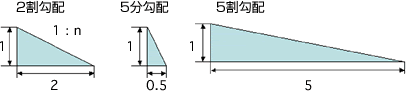 護岸や堤防などの斜面の部分の勾配(傾斜、傾き)です。直角三角形の鉛直高さを1としたときの水平距離がnの場合、1:nと表示します。たとえば1:2は2割勾配、1:0.5は5分勾配というような言い方をします。2割勾配は5分勾配よりも穏やかで、5割勾配よりも急です。