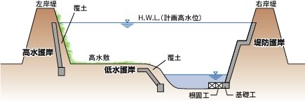 川を流れる水の作用(浸食作用など)から河岸や堤防を守るために、それらの表法面(おもてのりめん:川を流れる水があたる堤防などの斜面)に設けられる施設で、コンクリートなどで覆う構造のものです。