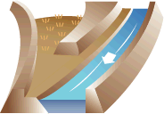 霞堤は、堤防のある区間に開口部を設け、その下流側の堤防を上流側の堤内地側に延長させて、開口部の上流の堤防と二重になるようにした不連続な堤防です。戦国時代から用いられており、霞堤の区間は堤防が折れ重なり、霞がたなびくように見えるようすから、こう呼ばれています。霞堤には2つの効果があります。1つは、平常時に堤内地からの排水が簡単に出来ます。もう一つは、上流で堤内地に氾濫した水を、霞堤の開口部からすみやかに川に戻し、被害の拡大を防ぎます。