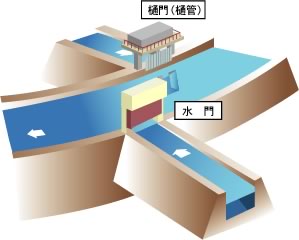 洪水、高潮及び塩水遡上の防御、用水の取入れ、河川への排水、あるいは舟航のため河川を横断し、又は堤防を切り開いて設けられる構造物をいい、水密性の全閉が可能な門扉を有しています。通常上部が開放されているものを水門といい、暗渠構造のものを樋門又は樋管といいます。一般的に通水断面の大きなものを樋門、小さいものを樋管と呼ぶことが多いです。