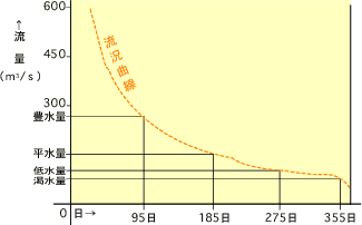ある地点において、1年間の日流量データを大きな流量から順に並べ替えた表を流況表といいます。この流況表から流量を縦軸に、累加日数を横軸に表したものを流況曲線といいます。