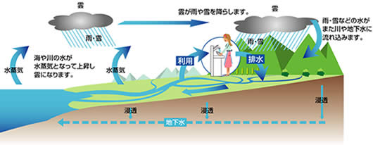 142.かんがい期、かんがい用水<かんがいき、かんがいようすい> 143.水循環<みずじゅんかん> 142.かんがい期、かんがい用水~143.水循環 142.かんがい期、かんがい用水<かんがいき、かんがいようすい> 水を川・湖などから引いてきて農地をうるおす期間のこと、またその用水のことをいいます。 143.水循環<みずじゅんかん> 海洋、湖沼、河川等の水が太陽熱エネルギーを受けて蒸発し、降雨として再び地表に降り注ぎ、河川水や地下水として流下し、海洋に至る水のめぐりのことをいいます。 利水目次 河川に関する用語集