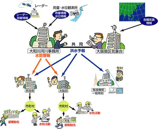 大雨などにより災害が発生するおそれがある場合に出されるもので、気象台から発表される洪水予警報と、国土交通省または都道府県と気象台が共同して発表する洪水予警報があります。