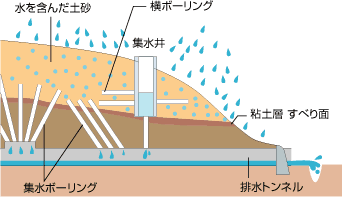 103.抑制工<よくせいこう> 103.抑制工 103.抑制工<よくせいこう> 地すべり地の地形、地下水などの状態を変化させて、地すべりを起こそうとする力自体を弱める手法のことで、その多くは地下水の量を減らすことを目的としています。 地すべり目次 河川に関する用語集
