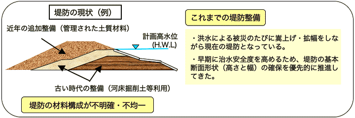 堤防の質的整備とは、堤防内に水が浸透することによって堤防の内部から破壊するのを防ぐ整備のことをいいます。(増水した河川水が堤防から溢れることを防ぐ嵩上げ・拡幅整備ではありません。)