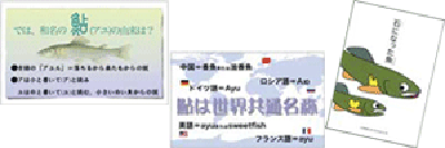 - アユの学名「Plecoglossus(プレコグロッソス)」はギリシア語に由縁、「Plekos(プレコス)=ひだのある」「glossa(グロッサ)=舌」、つまり「ひだのある舌」、「アユ」が付着藻類を食するのに適した口を上手く表しています。
