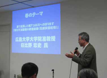 石炭灰を造粒して作製されたハイビーズを利用したヘドロを浄化する技術を開発された日比野先生から、この技術を用いて広島市を流れる一級河川太田川と広島湾奥に堆積したヘドロ(有機泥)の浄化のための取り組み、河口域でのアサリ場の復活事業のようすなど健全な河口域を取り戻す活動についてお話頂きました。