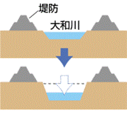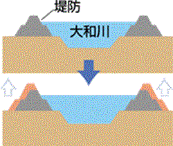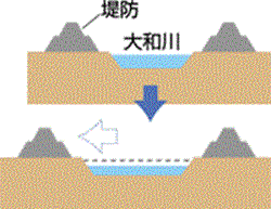 ひとたび大雨が降ると、氾濫しやすい大和川。 流域の安全性を高めるため河川の改修が必要です。