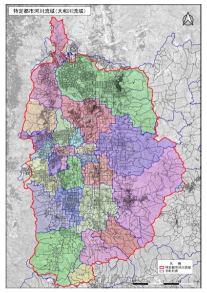 流域治水の本格的な実践に向けて、国土交通省では、令和3年11月1日に全面施行された流域治水関連法の中核をなす特定都市河川浸水被害対策法(以下「法」という。)のうち、法第3条の規定に基づき、令和3年12月24日に、一級河川大和川水系大和川他18河川と大和川流域について、特定都市河川及びの指定を行いました。これは同法の改正後、全国初となる特定都市河川の指定です。