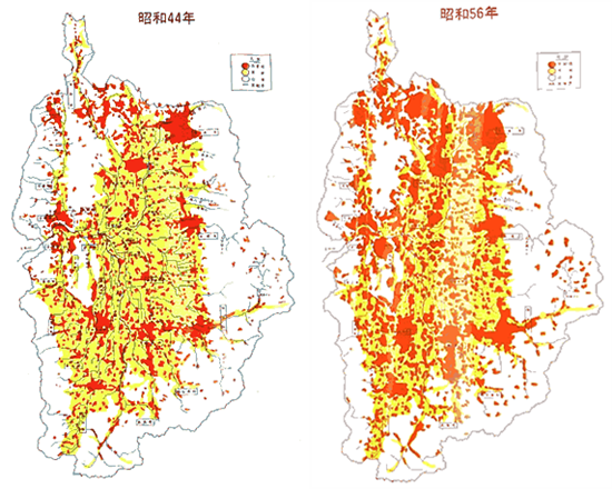 このため、市街地は昭和44年には流域の16%に過ぎなかったが、昭和56年には、23%となっており、佐保川、竜田川、富雄川、葛下川流域等の都市化の進展が著しい。土地利用の変遷を見ると、図-1、2のとおりである。