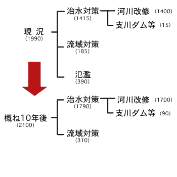 流域整備は、治水対策と地域対策の2本の柱からなり、期間は概ね10年間を目標とする。